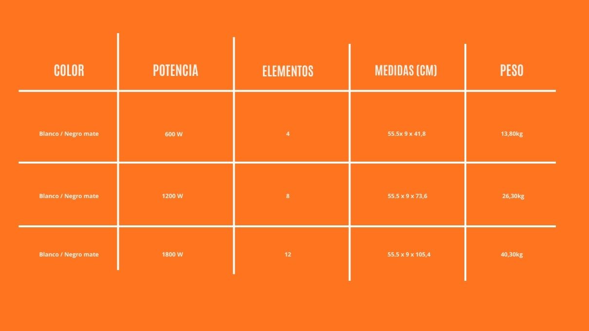 Disponible en tres potencias (600 W, 1200 W y 1800 W), el radiador Olympia se adapta a cualquier estancia ofreciendo un calor envolvente, sostenible y de bajo consumo. Eficiencia, confort y diseño en un solo radiador.